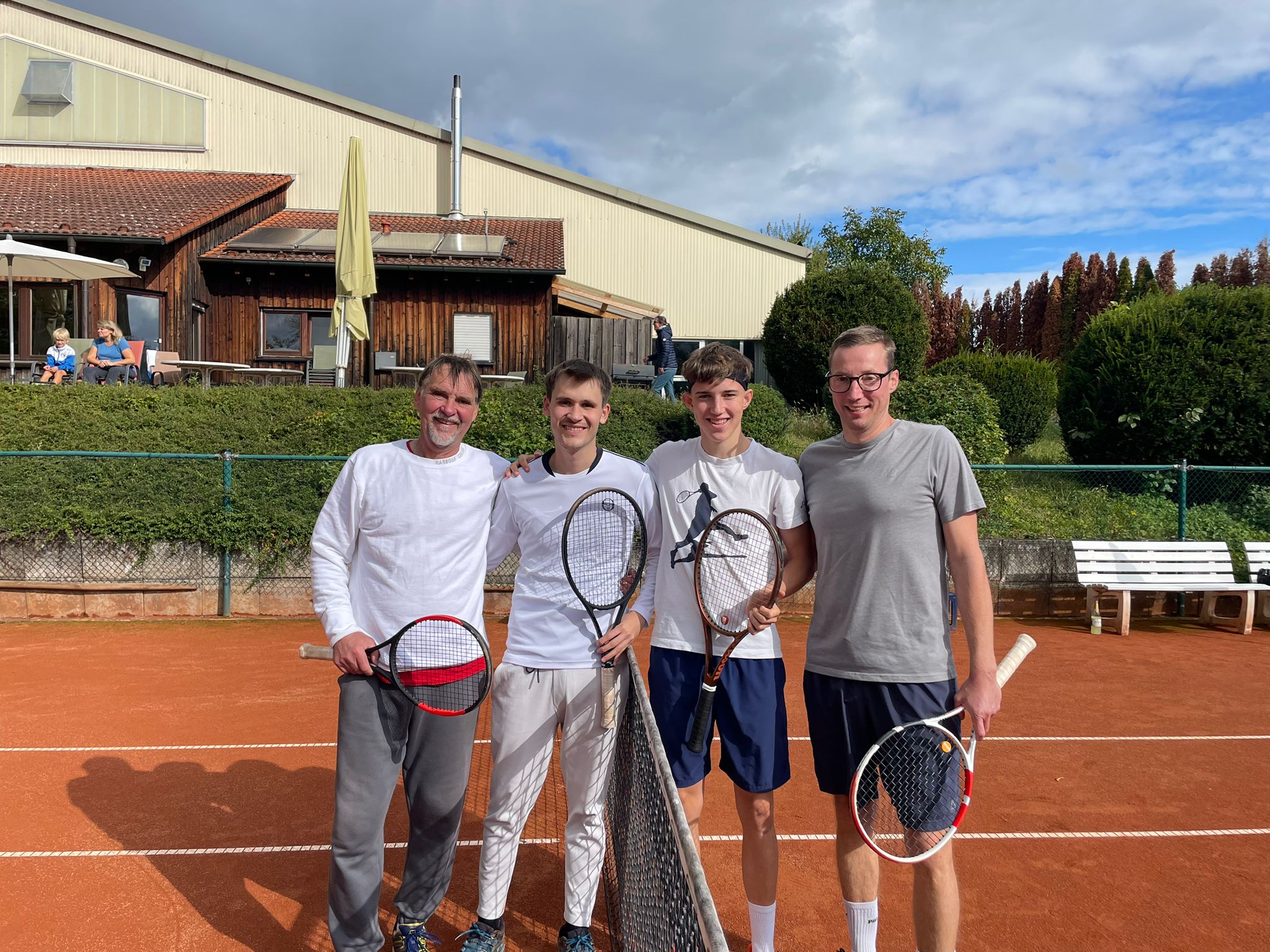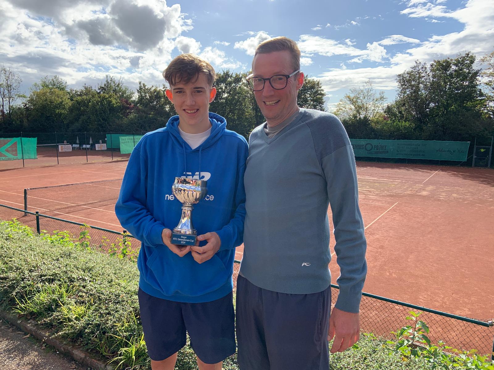 Wieder eine runde Sache war der 2. Generationen-Cup, der am vergangenen Samstag auf der Anlage des RTC gespielt wurde. Schon bei der ersten Austragung im vergangenen Jahr fand die Idee von Sportwart Kadir Yildirim großen Anklang und alle Teilnehmer waren für eine Wiederholung. 12 Paare mit einem Altersunterschied von mindestens 20 Jahren hatten diesmal gemeldet. 4 Gruppen zu je drei Paaren wurden ausgelost, womit jedes Doppelpaar mindestens 2 Spiele zu bestreiten hatte. Viele unterschiedliche Paarungen waren am Start: Junioren mit Mannschaftsspielern, Anfänger mit erfahrenen Spielern, Kind mit Elternteil und im wahrsten Sinne des Wortes klein mit groß. Alle Spieler hatten Spaß und die auch Zuschauer kamen auf ihre Kosten und konnten tolle Ballwechsel beobachten. Bewundernswert war, mit welchem Eifer besonders auch die Kids dabei waren. Die vier Gruppenersten spielten dann das Halbfinale und die Sieger daraus das Finale. Den Siegerpokal in einem tollen Endspiel holten sich Fabian und Valentin Rommel gegen Thilo und Marvin Schick.