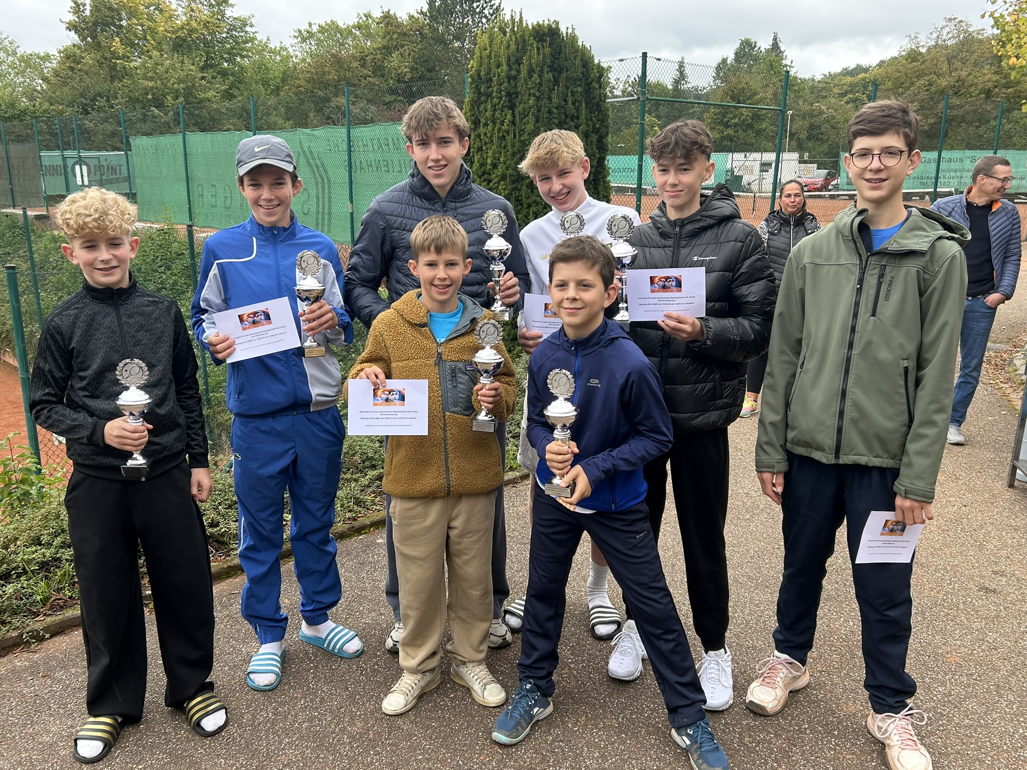 Neben den Endspielen am Sonntag Mittag gab es morgens ein Matchtraining mit unseren Tennisassistenten Valentin und Theo Rommel. Insgesamt 15 Nachwuchsspieler folgten konzentriert den Anweisungen und gingen motiviert an die gestellten Aufgaben. Da ist es nicht verwunderlich, dass die U 9 Mannschaft des RTC Marbach auch im Winter wieder auf Punktejagd geht. Nach einem 6. Platz in der Sommerrunde bleibt Luft nach oben, insbesondere weil die Kinder erst zwischen 6 und 7 Jahre alt sind und vor allem das Sammeln von Spielerfahrung und der Spaß am gemeinsamen Sport im Vordergrund stehen. Das sich Durchhaltevermögen auszahlt haben die Spieler der MidCourt U 10 Mannschaft erfahren: Travis Pflugfelder, Levin Stark, Ilias Kleiber, Louis Forisch, Lilly Skorepa und Hugo Melzheimer erkämpften sich den ersten Platz und damit den Gruppensieg in dieser Altersklasse.